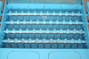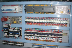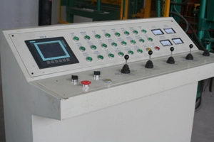 PLC a dotyková obrazovka jsou produkty od společnosti Siemens, Německo. Jedna elektronická ovládací skříň ovládá jak stroj na výrobu bloků, tak zakladač, což usnadňuje obsluhu a diagnostiku poruch.