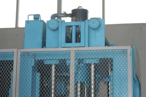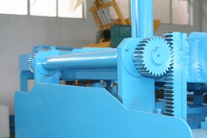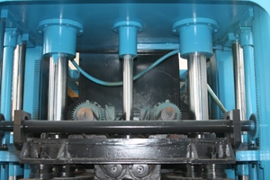 Synchronní odformovací systém, který je poháněn ozubenými koly a řetězy, zajišťuje synchronní práci dvou vyjímacích válců a stabilní pohyb forem